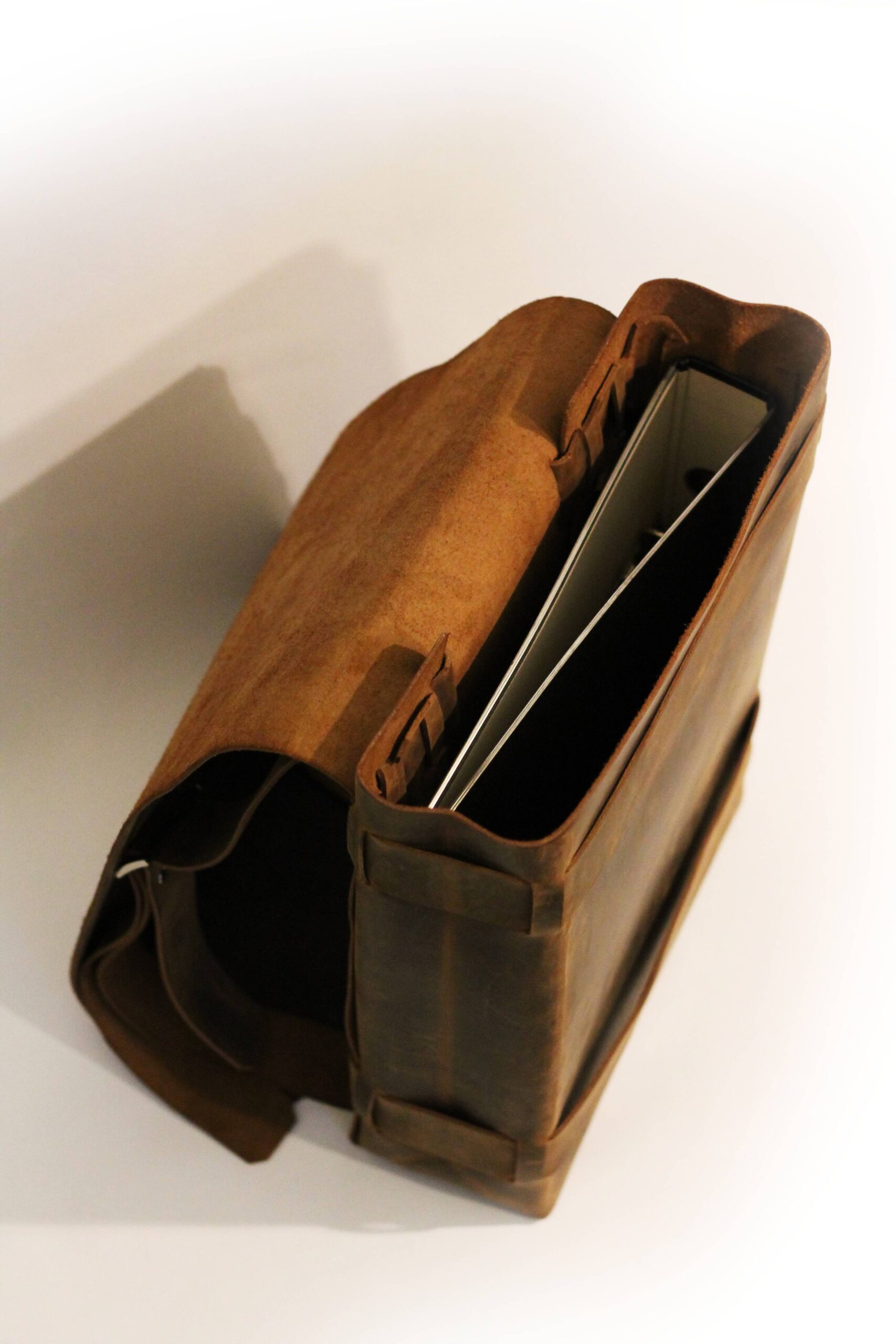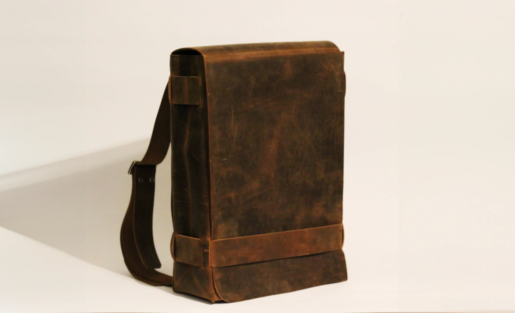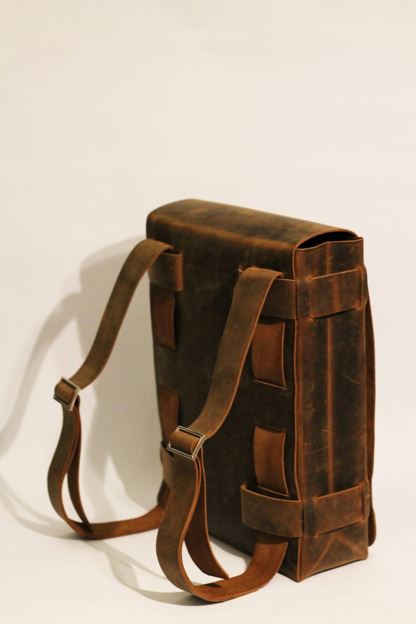 Der Rucksack wurde aus einem Stück vegetatil gegerbten Rinderleder gefertigt. Die Faltung aus einem Stück wird durch die Riemen zusammengehalten. Dadurch gibt es keine Nähte die sich auflösen könnten.
